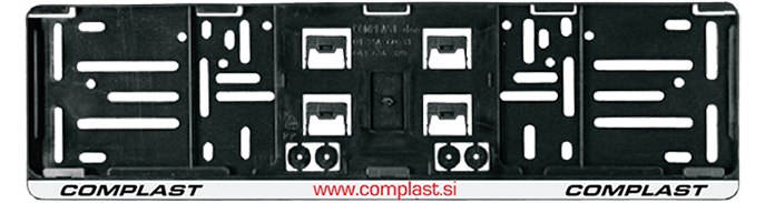 Okvir je izdelan iz elastične plastične mase, zaradi česar je primeren tudi za montažo na neravne podlage. Prožnost materiala okvirju omogoča tudi odpornost na večino mehanskih poškodb. Registrsko tablico telo enostavno montiramo s tremi zatiči (+1), ki so del okvirja. Tisk je možen na spodnji rob do višine 16 mm